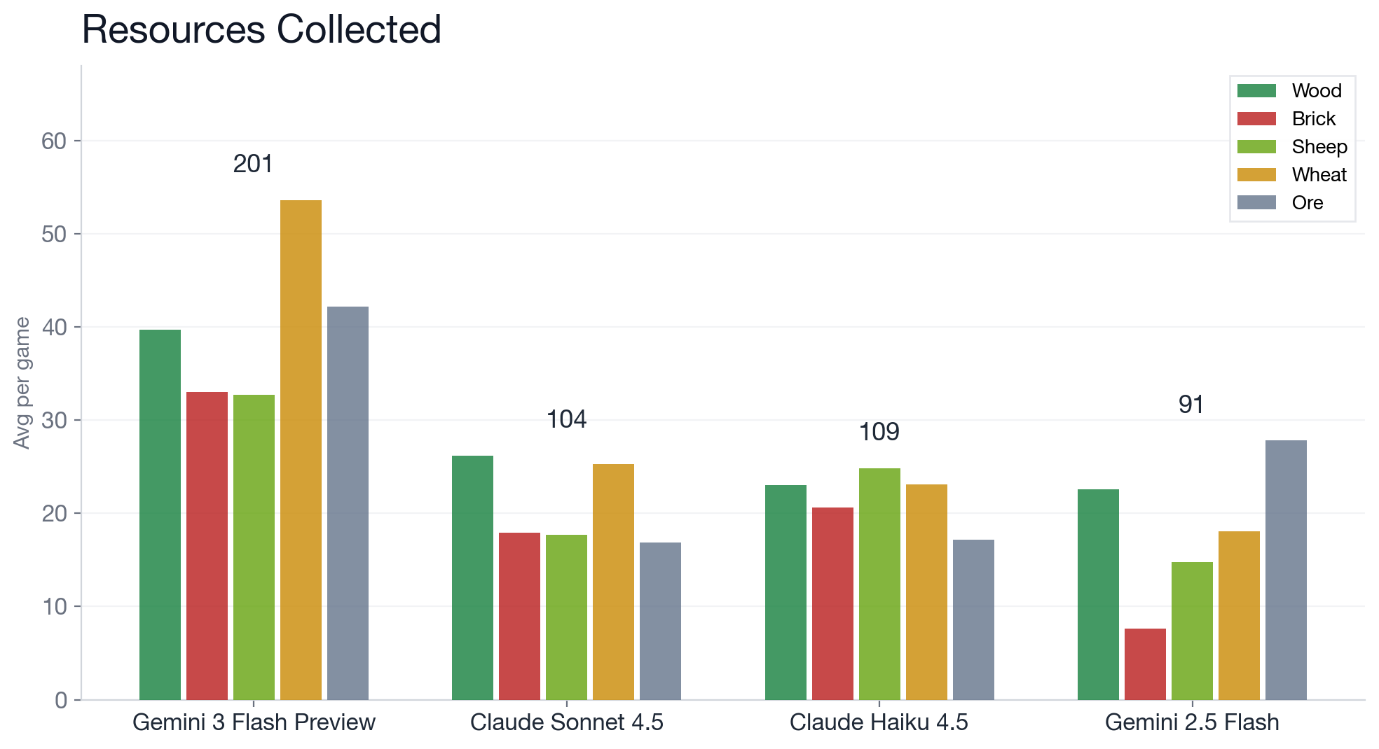 The resource numbers explain more than the leaderboard does. Gemini 3 Flash collected an average of 201 resources per game; the runner-up (Haiku 4.5) collected 109. That 2x gap starts on the very first turn.